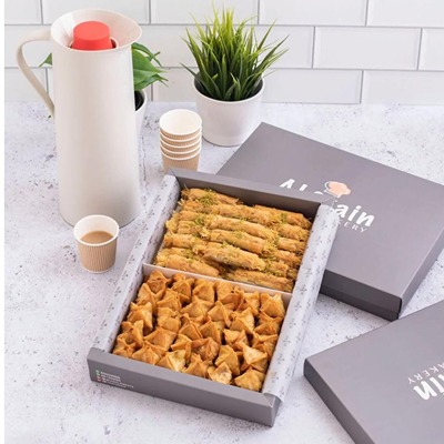 كيلو من آكثر المنتجات طلبا حلو الورد وجلاش الجبن او الفستق حسب الرغبة مع مطارة سعة لتر قهوة عربية مجهزة بآكواب ورقية عازلة للحرارة.